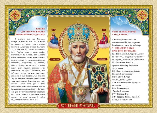 Позначено православні свята, дні постів, іменини. Дні суворого і звичайного постів, виділені різним кольором. На кожен місяць молитва.