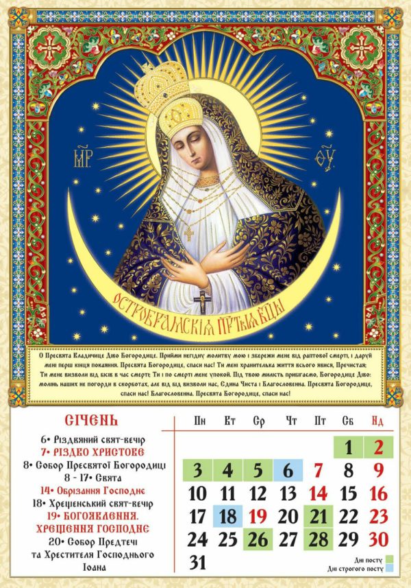 Позначено православні свята, дні постів, іменини. Дні суворого і звичайного постів, виділені різним кольором. Є молитви.