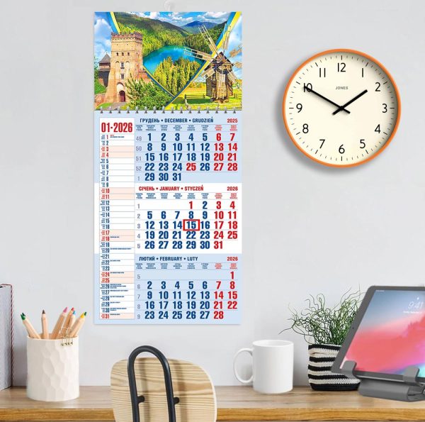 Календарна сітка на трьох мовах: українська, англійська, польська.