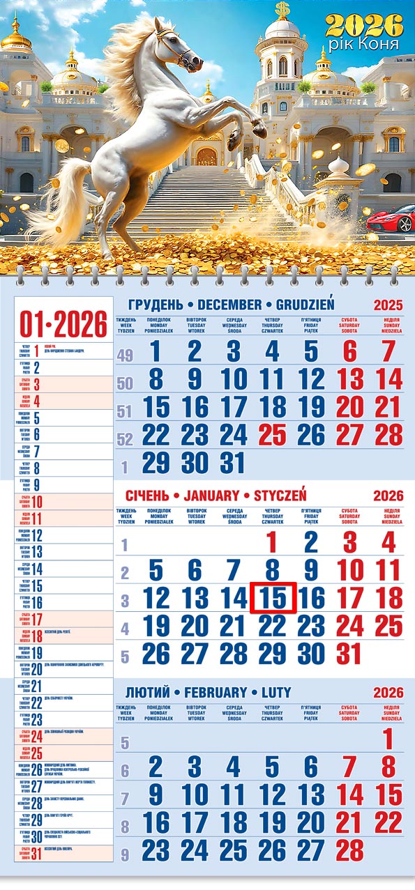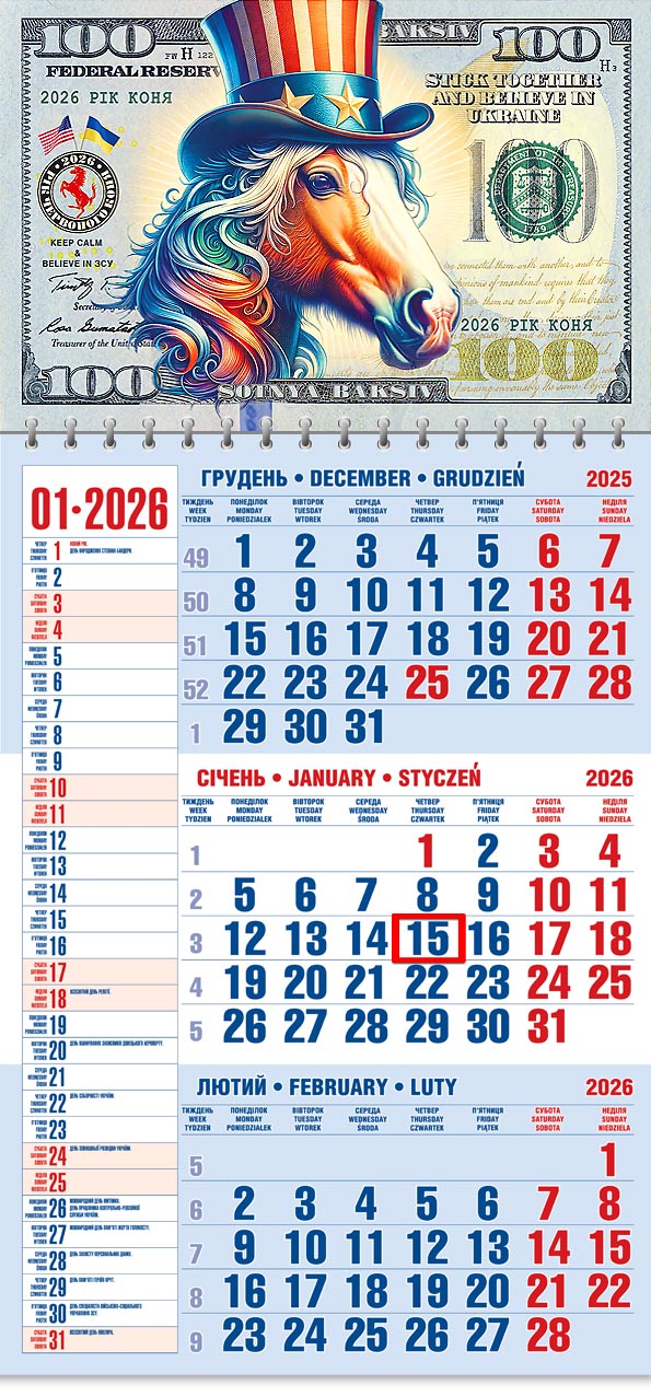 Календарна сітка на трьох мовах: українська, англійська, польська.