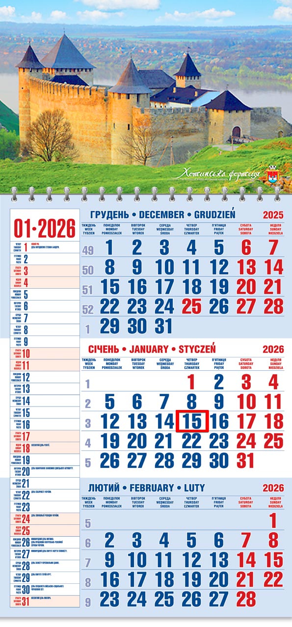 Календарна сітка на трьох мовах: українська, англійська, польська.