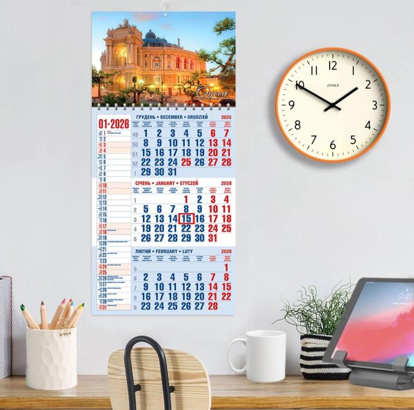 Матеріал: основа – картон, календарна сітка – крейдований папір, скріплені пружиною.