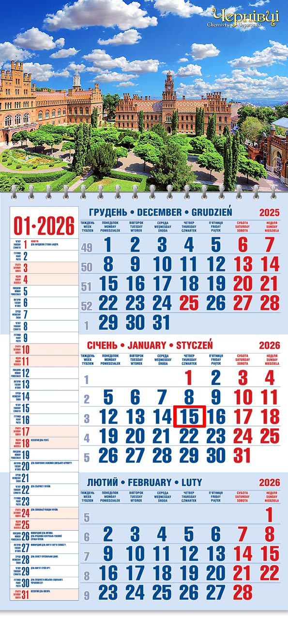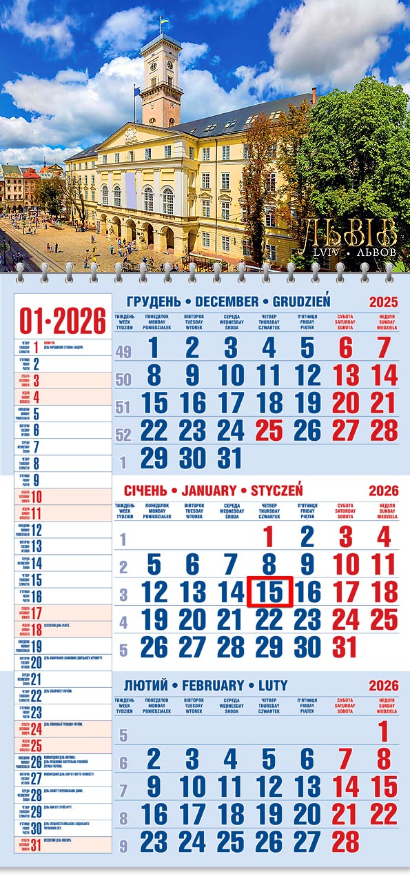 Календарна сітка на трьох мовах: українська, англійська, польська.