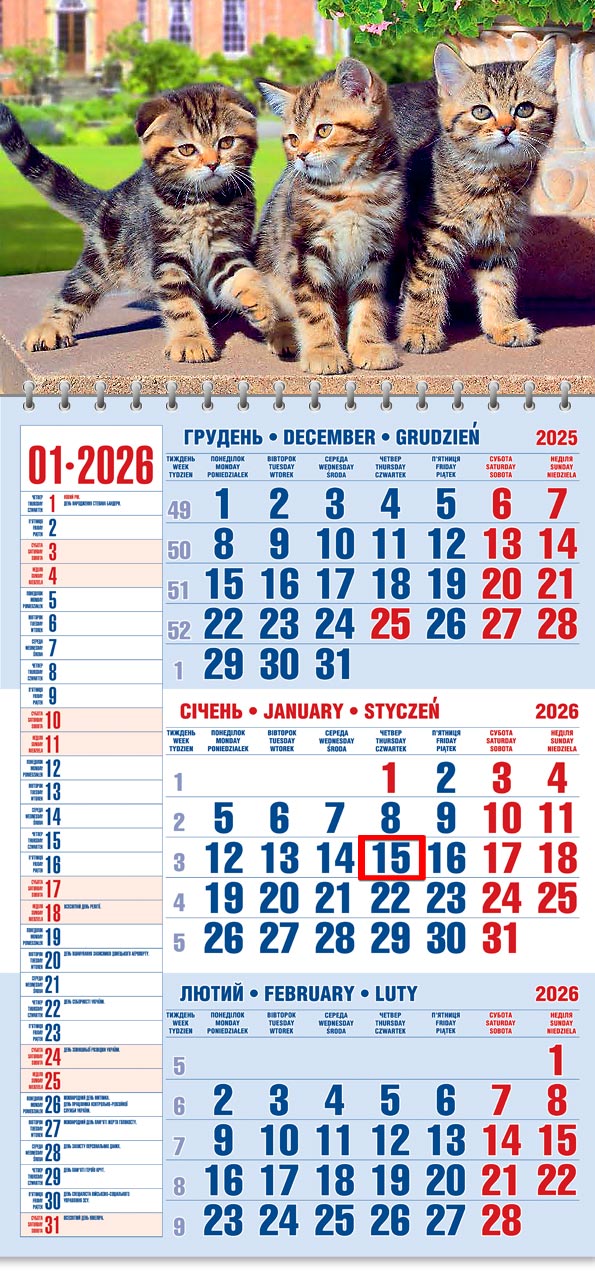 Календарна сітка на трьох мовах: українська, англійська, польська.