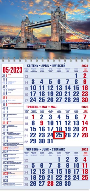 Календарна сітка на трьох мовах: українська, англійська, російська.