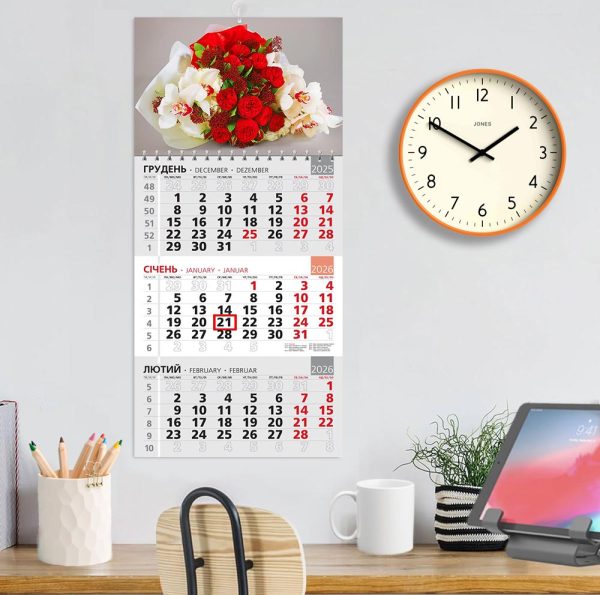 Матеріал: основа – картон, календарна сітка – крейдований папір, скріплені пружиною.