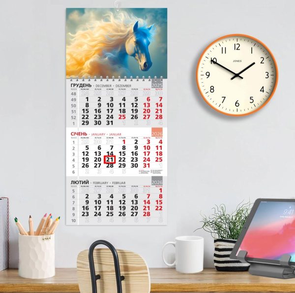 Матеріал: основа – картон, календарна сітка – крейдований папір, скріплені пружиною.