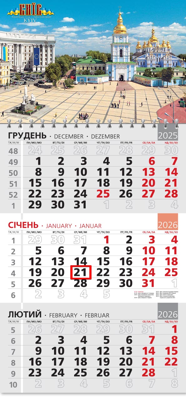Календарна сітка на трьох мовах: українська, англійська, німецька.