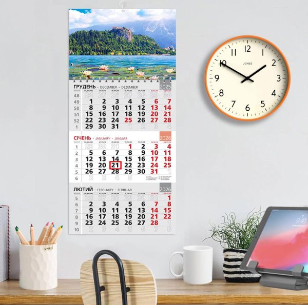 Календарна сітка на трьох мовах: українська, англійська, німецька.