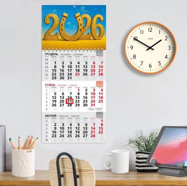 Матеріал: основа – картон, календарна сітка – крейдований папір, скріплені пружиною.