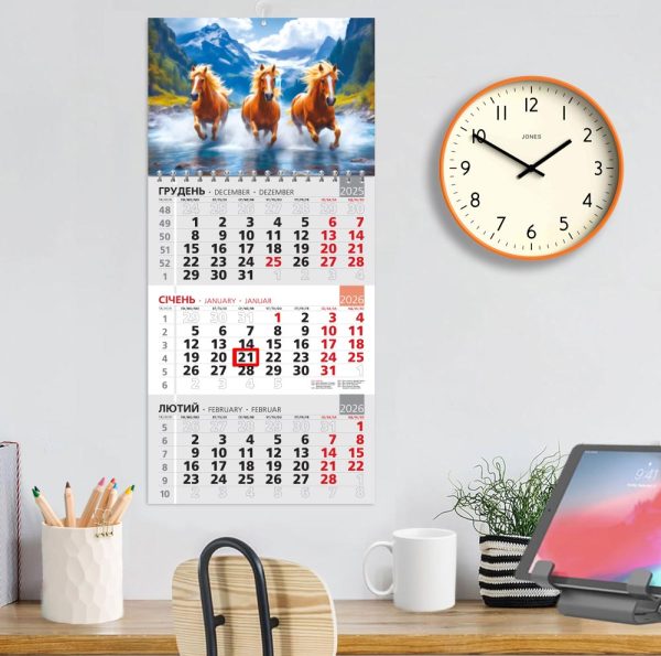 Матеріал: основа – картон, календарна сітка – крейдований папір, скріплені пружиною.