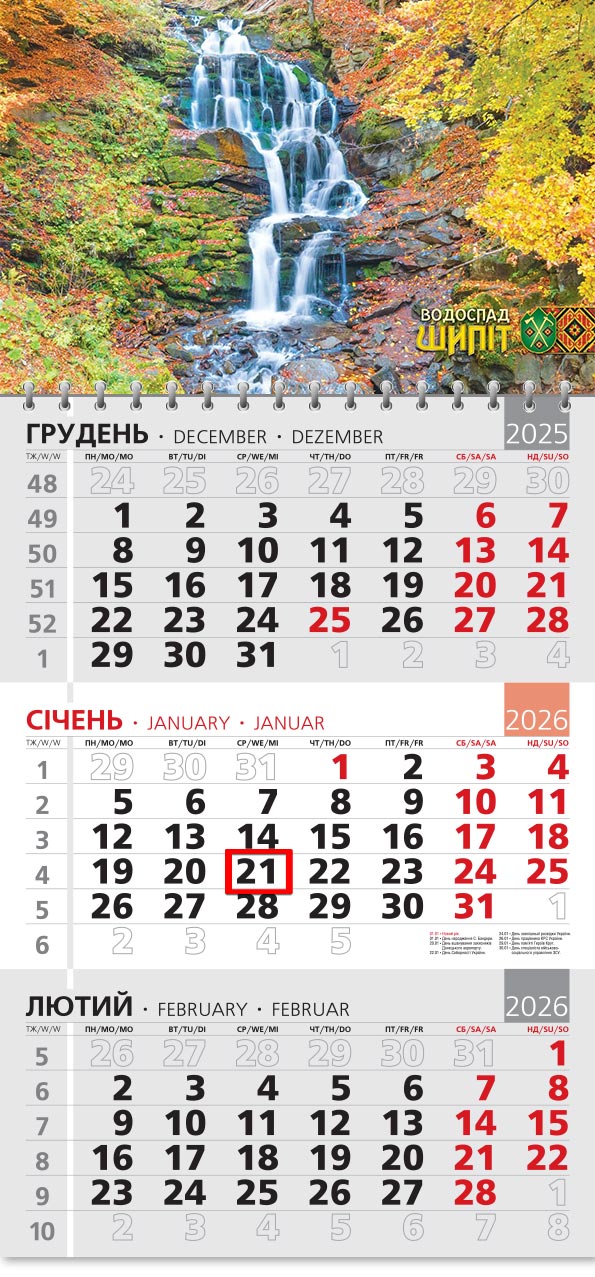Календарна сітка на трьох мовах: українська, англійська, німецька.