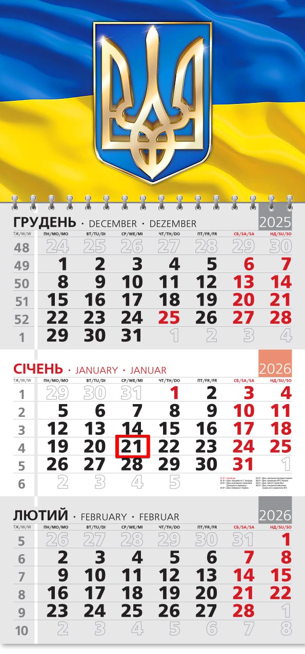 Календарна сітка на трьох мовах: українська, англійська, німецька.