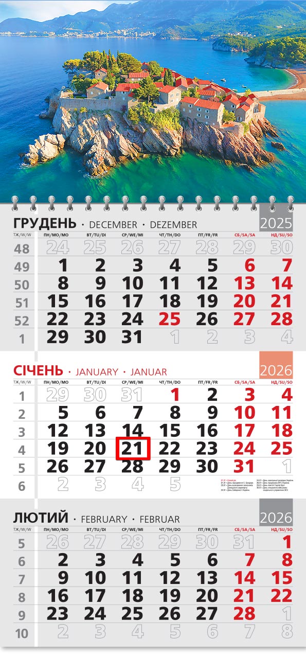 Три місяці на розвороті, зверху минулий, по центру поточний, нижній наступний місяць.