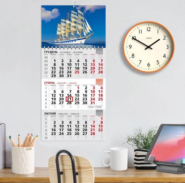 Матеріал: основа – картон, календарна сітка – крейдований папір, скріплені пружиною.