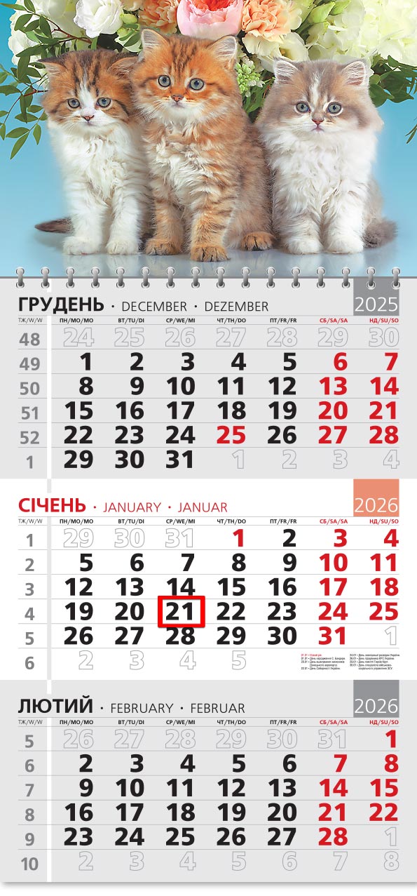 Календарна сітка на трьох мовах: українська, англійська, німецька.