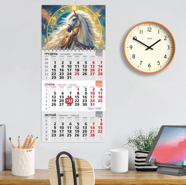 Матеріал: основа – картон, календарна сітка – крейдований папір, скріплені пружиною.