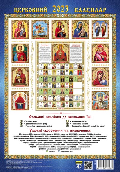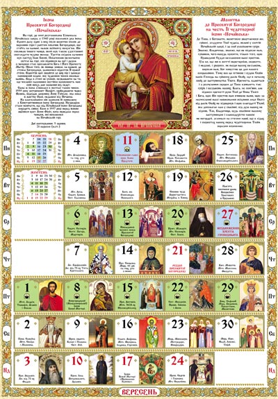 Церковна серія, один місяць на сторінці. Позначено православні свята, дні постів, іменини. Дні строгого і звичайного постів, виділені різним кольором. На кожній сторінці молитва.