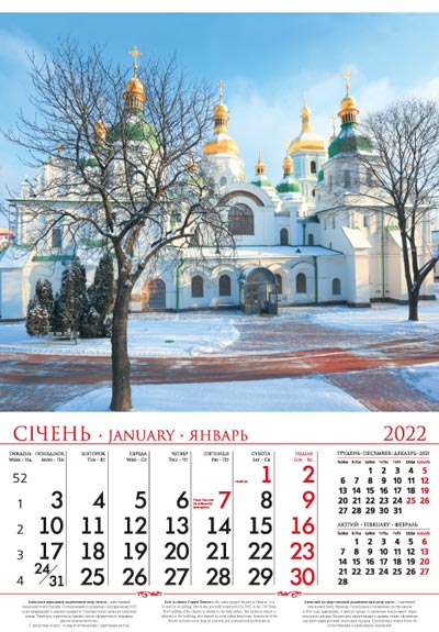 Календарна сітка квартальна. Три місяці на одній сторінці. У великих клітинках з датами, зручно робити нотатки. Позначені державні, професійні, міжнародні та православні свята. Календарна сітка на трьох мовах: українська, англійська, російська.