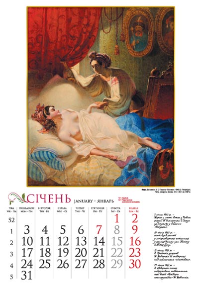Один місяць на сторінці. Клітинки з датами великі і дозволяють робити в них замітки. Позначені державні і православні свята. Нумерація тижнів року. Календарна сітка на трьох мовах: українська, англійська, російська.