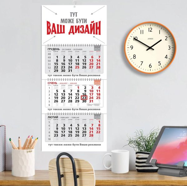 Три місяці на розвороті, зверху минулий, по центру поточний, нижній наступний місяць. Всі три блоки роздільні і скріплені пружиною. Листи з розкладкою місяців – відривні.